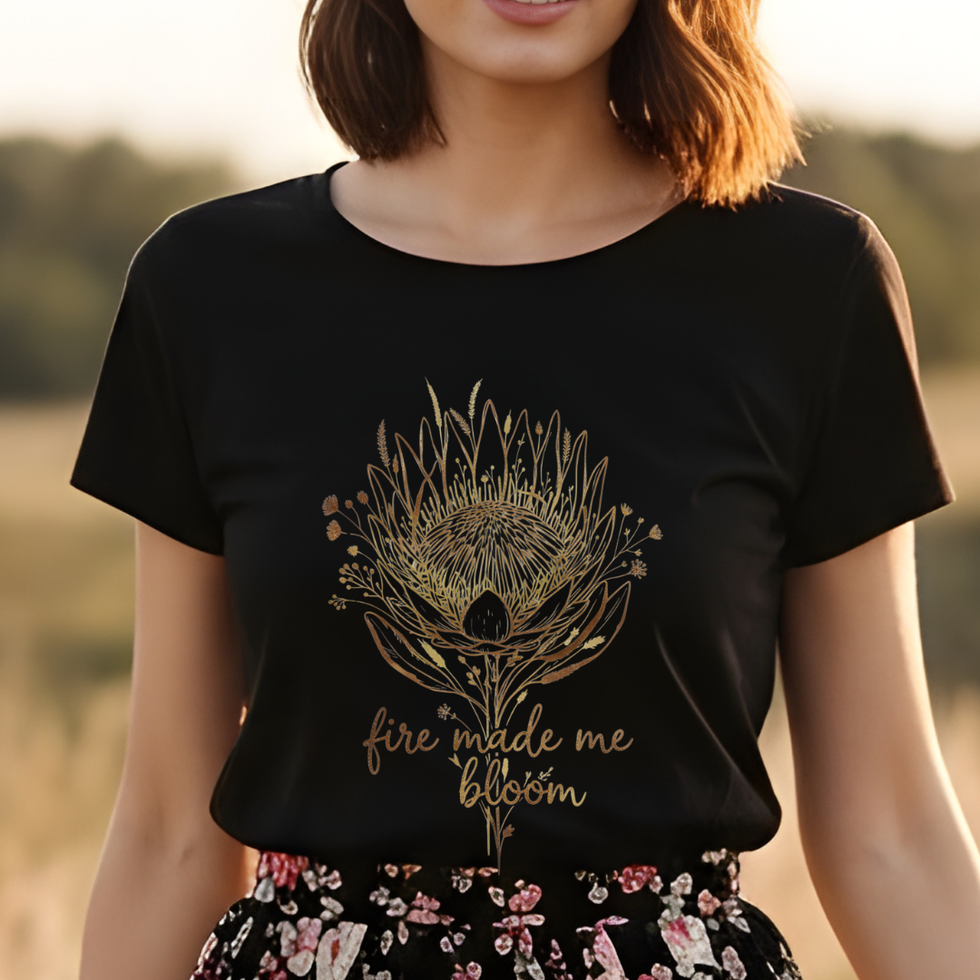 This meaningful spiritual t-shirt features a beautifully illustrated King Protea, the national flower of South Africa, surrounded by delicate wild botanicals and the powerful phrase “Fire Made Me Bloom.”
